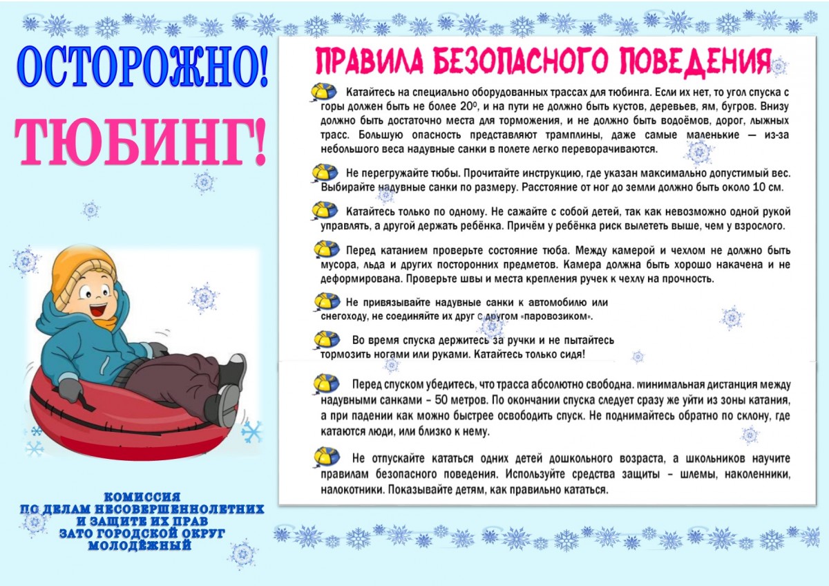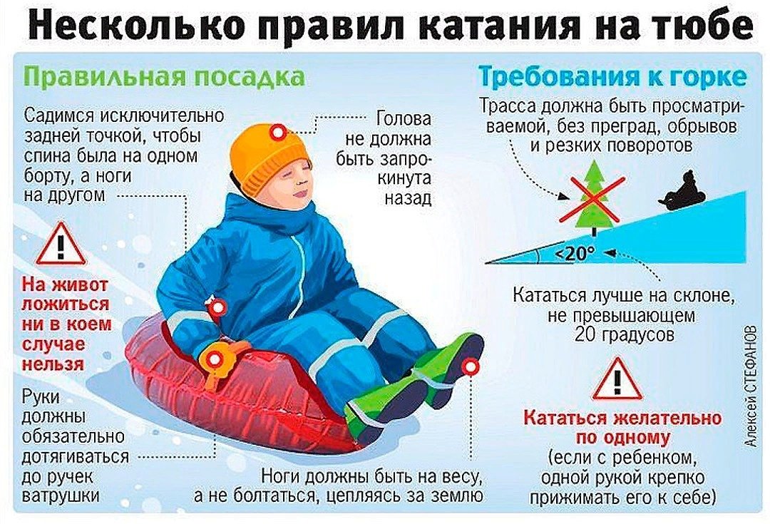 Катание на тюбингах (в народе называемых «ватрушками» или «бубликами») – это отдых, который одинаково подходит взрослым и детям, но, к сожалению, это еще и один из самых травмоопасных видов отдыха. В отличие от санок «ватрушки» способны развивать большую скорость и даже закручиваться вокруг своей оси во время спуска. При этом они абсолютно неуправляемы и не оборудованы тормозным устройством. Отдыхающим не стоит забывать о п